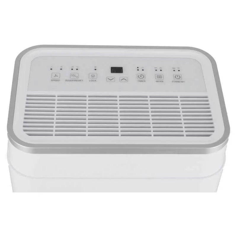 Prosty w obsłudze panel sterowania oferuje różnorodne opcje, takie jak wybór trybu pracy, ustawienie wilgotności, prędkości wentylatora, aktywację timera oraz zarządzanie blokadą rodzicielską.