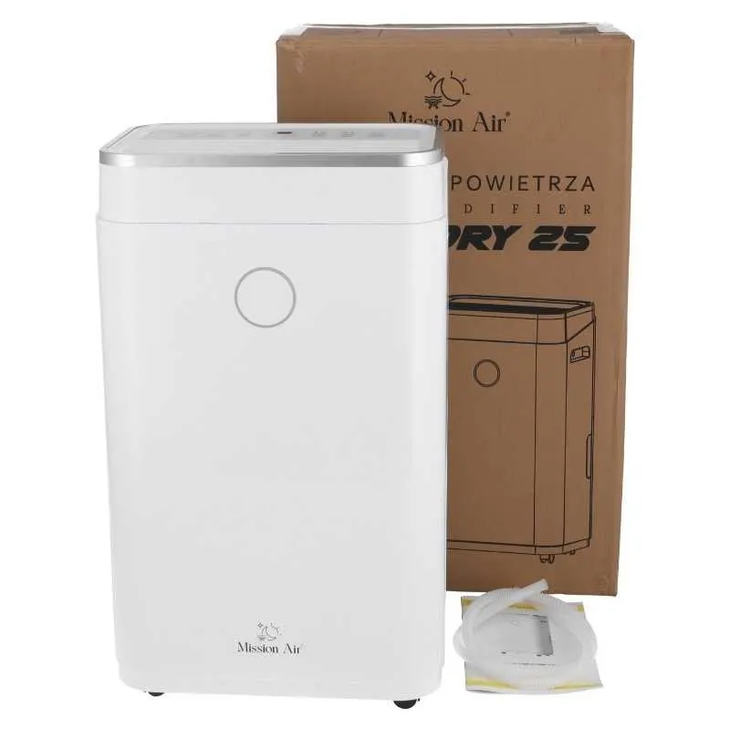 Osuszacz powietrza Mission Air OptiDry 25L to urządzenie, które zapewnia komfortowe i zdrowe środowisko w domu, eliminując nadmiar wilgoci. Jego zdolność do usuwania aż do 25 litrów wody w stałych warunkach 30℃, RH80%. Urządzenie oferuje wygodne funkcje, takie jak sterowanie przez WiFi, automatyczny tryb pracy, timer, tryb uśpienia i blokadę rodzicielską. OptiDry 25L jest idealny do szybkiego wysuszania prania oraz w sytuacjach awaryjnych, jak zalanie. Posiada intuicyjny panel sterowania i możliwość zdalnego zarządzania za pomocą aplikacji mobilnej, zapewniając wygodę użytkowania. Jak na dość niewielki osuszacz i podstawową wydajność dysponuje dużym zbiornikiem na wodę – mieści aż 6 litrów. W zestawie znajdziesz: