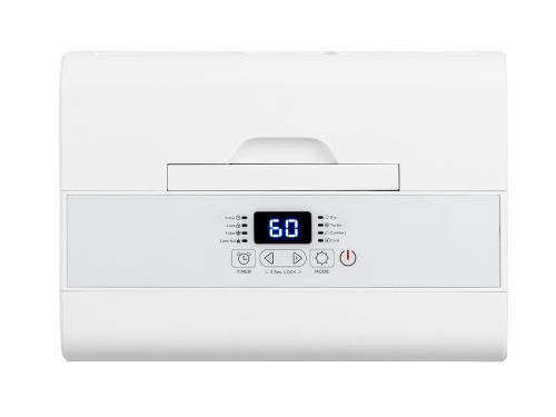 Urządzenie jest wyposażone w prosty w obsłudze panel sterowania z cyfrowym wyświetlaczem, umieszczonym na górnej części. Duże, czytelne przyciski ułatwiają obsługę, a wyświetlacz informuje o aktualnym poziomie wilgotności. Panel sterowania zawiera również ikony wskazujące na aktywację timera, tryb pracy, poziom napełnienia zbiornika na wodę oraz tryb ciągłego osuszania.